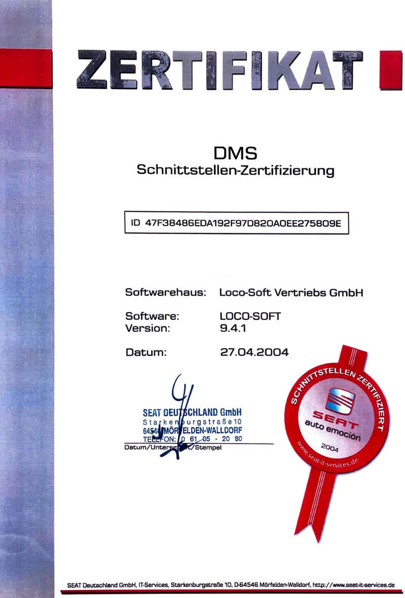 Die SEAT Deutschland GmbH erteilt Loco-Soft das Seat Softwarezertifikat
